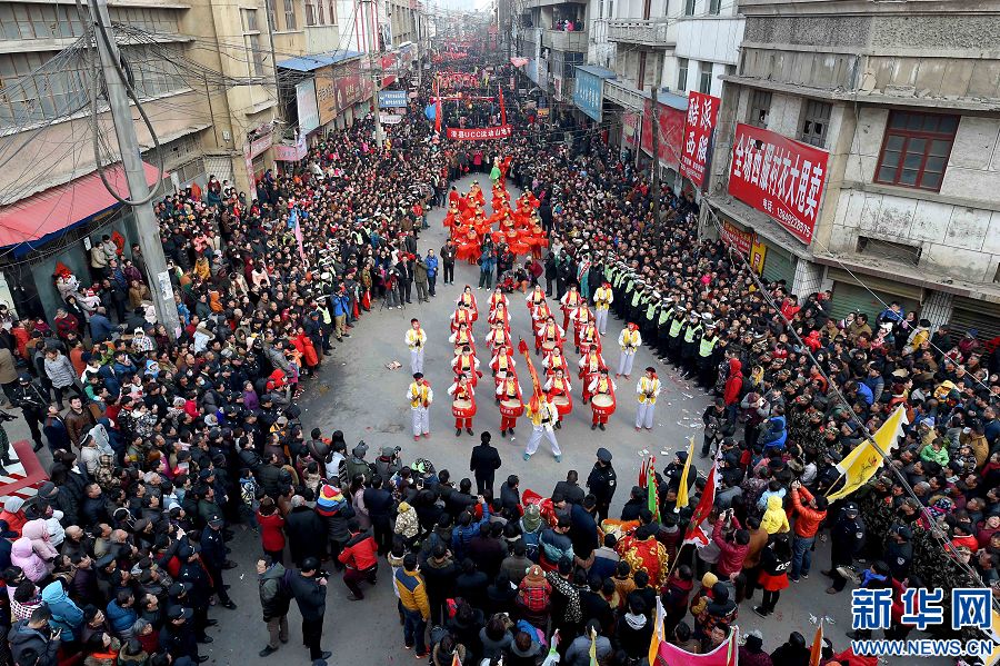 2月23日,河南省?h民間社火團(tuán)體在古廟會(huì)上演出。
