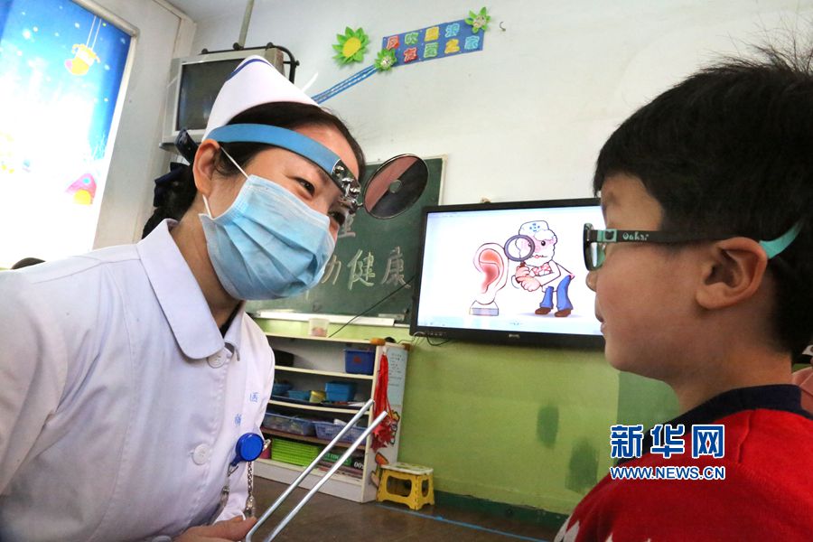 2016年3月2日,河南省安陽(yáng)市婦女兒童活動(dòng)中心幼兒園,來(lái)自安陽(yáng)地區(qū)醫(yī)院耳鼻喉科的醫(yī)生曹艷利正在和大三班的任博森小朋友親切交流并用音叉(聽(tīng)力檢測(cè)儀)為其做聽(tīng)力檢查。