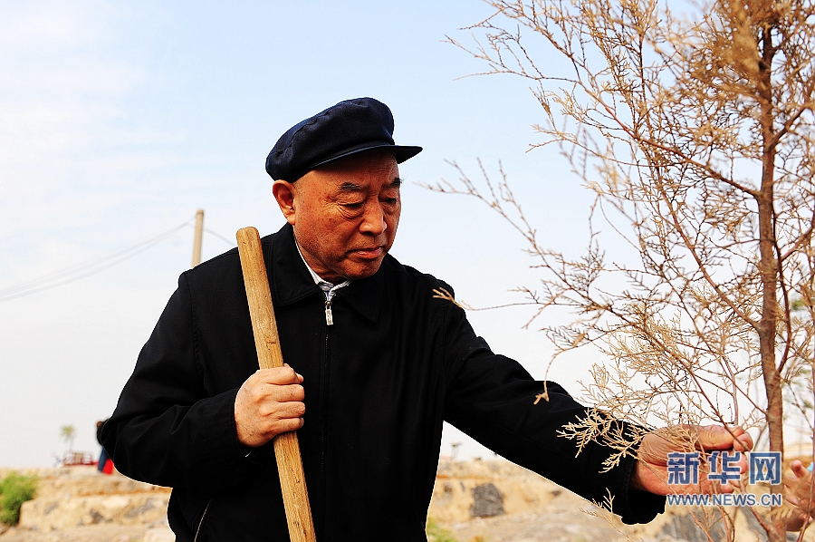 在河南衛(wèi)輝市唐莊鎮(zhèn),吳金印在查看一棵新種下的柏樹的生長情況(5月25日攝)。