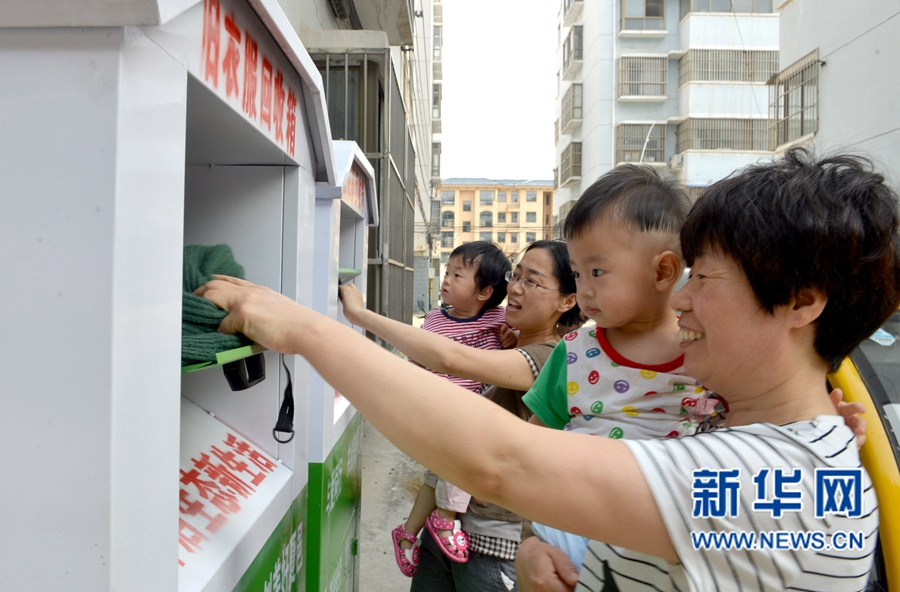 共青團(tuán)河南省夏邑縣委和當(dāng)?shù)匾患一厥掌髽I(yè)聯(lián)合將100個(gè)環(huán)保舊衣回收箱投放居民區(qū)。居民可以將舊衣服放進(jìn)箱中供再生資源企業(yè)回收,回收后的舊衣進(jìn)行分級處理,一等級舊衣物將清洗消毒后捐獻(xiàn)給貧困地區(qū),其余等級的舊衣物處理后制作救災(zāi)帳篷或進(jìn)行完全回收處理。