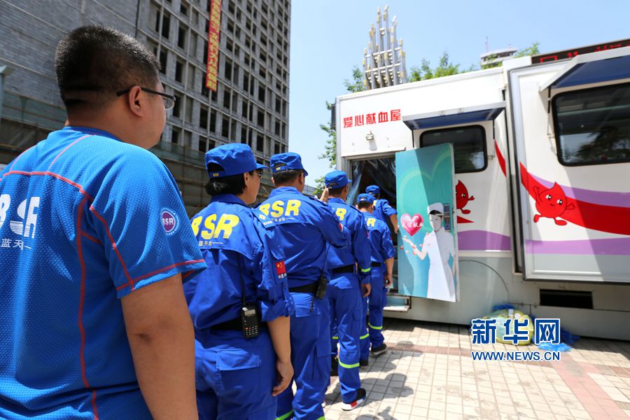 02016年6月14日,河南安陽(yáng)老市政廣場(chǎng)愛(ài)心獻(xiàn)血屋,來(lái)自安陽(yáng)、林州藍(lán)天救援隊(duì)的隊(duì)友排長(zhǎng)隊(duì)參與無(wú)償獻(xiàn)血。