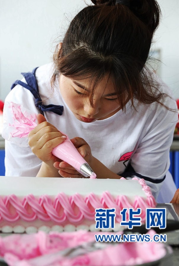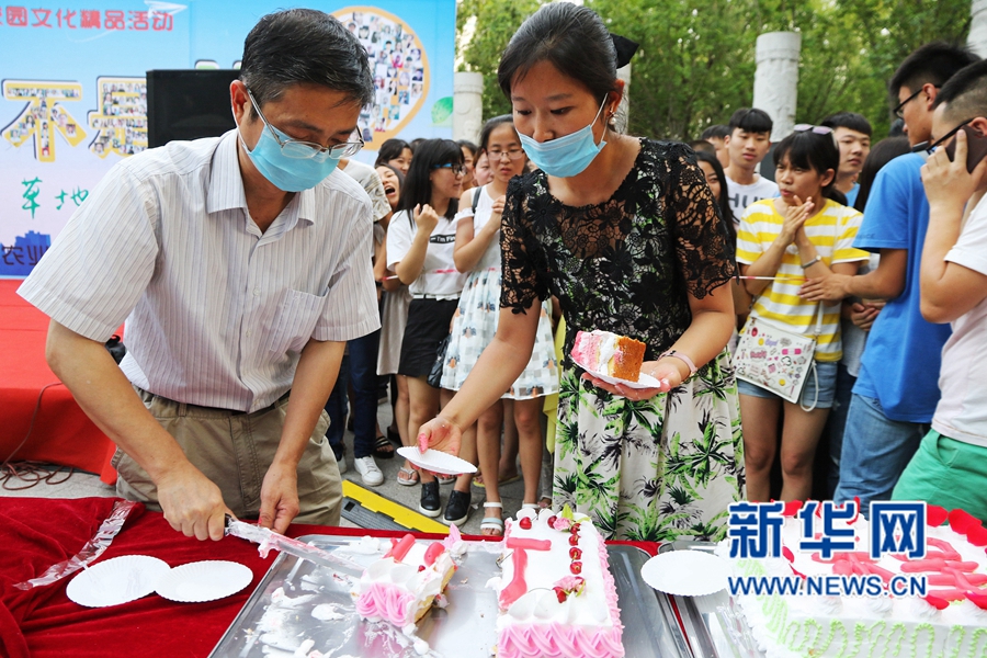 6月14日,河南農(nóng)業(yè)大學(xué)食品學(xué)院黨委副書記魏瑋在蛋糕上寫下“前程似錦”字樣,祝福畢業(yè)生。