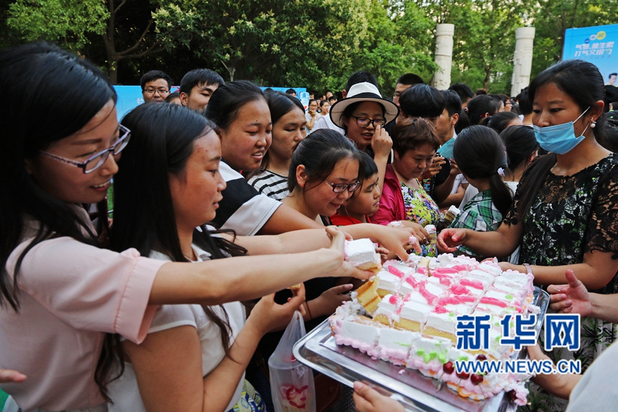 據(jù)了解,制作分發(fā)這塊巨型蛋糕是該學(xué)院“我的未來不是夢(mèng)”2016屆畢業(yè)生草地音樂節(jié)的一個(gè)環(huán)節(jié)。蛋糕是由食品學(xué)院的六名研究生耗費(fèi)了將近16個(gè)小時(shí),使用了雞蛋600余枚、進(jìn)口混合奶油30斤、白砂糖16斤、植物油8斤、面粉16斤。新華網(wǎng)發(fā)(王威 王克偉 攝)