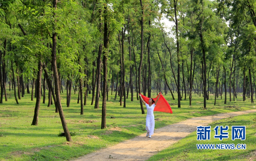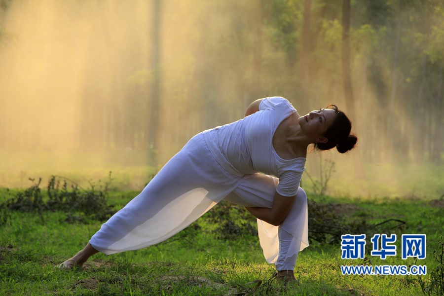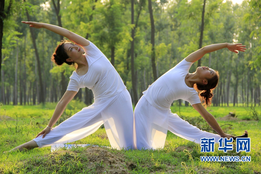 夏至?xí)r節(jié),河南省內(nèi)黃縣瑜伽愛(ài)好者走進(jìn)槐林深處,在樹(shù)蔭下舒展身心,靜享清涼。新華網(wǎng)發(fā)(劉肖坤