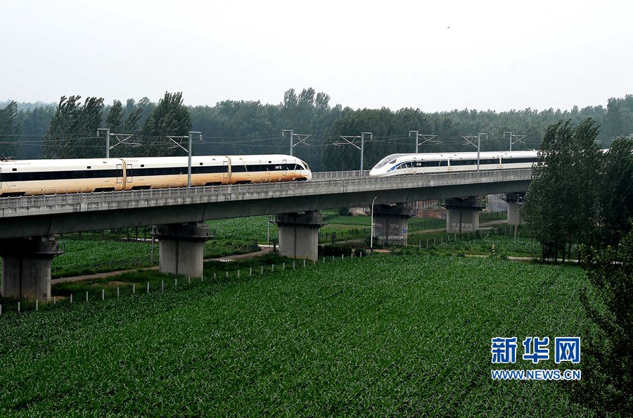 7月15日11時(shí)20分,兩列自主研制的中國(guó)標(biāo)準(zhǔn)動(dòng)車(chē)組“金鳳凰”(左)和“海豚藍(lán)”在鄭(州)徐(州)線(xiàn)上,分別以420公里的速度交會(huì)而行,這是世界最高速的動(dòng)車(chē)組交會(huì)試驗(yàn)。