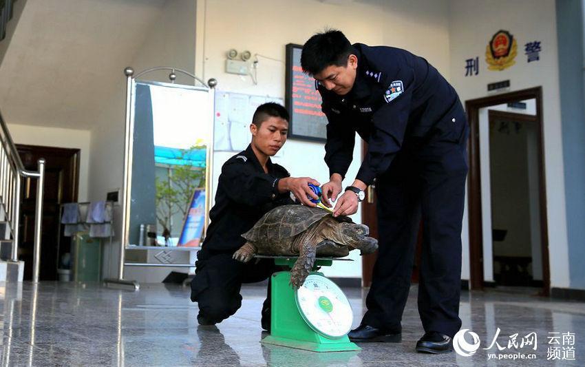 當(dāng)日上午9點(diǎn),勐?h森林公安局民警接到群眾報(bào)案稱(chēng):“該縣一茶廠內(nèi)有人非法飼養(yǎng)國(guó)家重點(diǎn)保護(hù)動(dòng)物凹甲陸龜。常宗波 攝 圖片來(lái)源:人民網(wǎng)