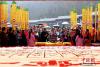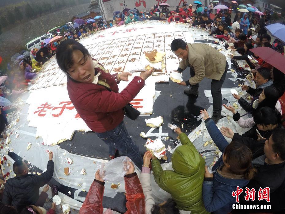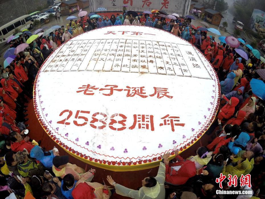 2017年3月12日(農(nóng)歷二月十五)是老子李耳誕辰2588年紀(jì)念,道教圣地河南洛陽(yáng)老君山,世界第一高的老子銅像下,一個(gè)超級(jí)大蛋糕趕制完成,老子的千古巨著《道德經(jīng)》也被“寫(xiě)”到了大蛋糕上,大批民眾圍觀,場(chǎng)面宏大。據(jù)了解,為趕制這個(gè)《道德經(jīng)》大蛋糕,主辦方用了雞蛋30000枚、白糖900斤、純牛奶600斤、奶油1200斤等物料,蛋糕總重達(dá)5噸。相傳河南欒川老君山是道教始祖李耳的歸隱地,每年都有大批的信眾前去紀(jì)念老子誕辰。經(jīng)老君山道長(zhǎng)的加持祈福后,這個(gè)超級(jí)《道德經(jīng)》大蛋糕被近萬(wàn)民眾陸續(xù)分食一空。 中新社記者 王中舉 攝 -