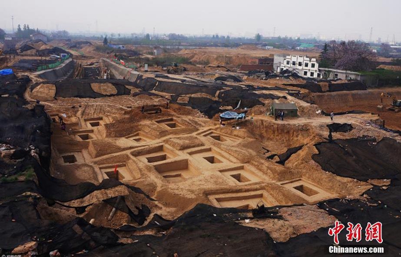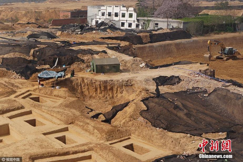 2017年4月14日,鄭州市一處叫常莊的拆遷城中村上,施工人員在村民民房下發(fā)現(xiàn)一片春秋戰(zhàn)國時(shí)期的古墓群,目前正在進(jìn)行發(fā)掘中。 圖片來源:視覺中國 -