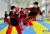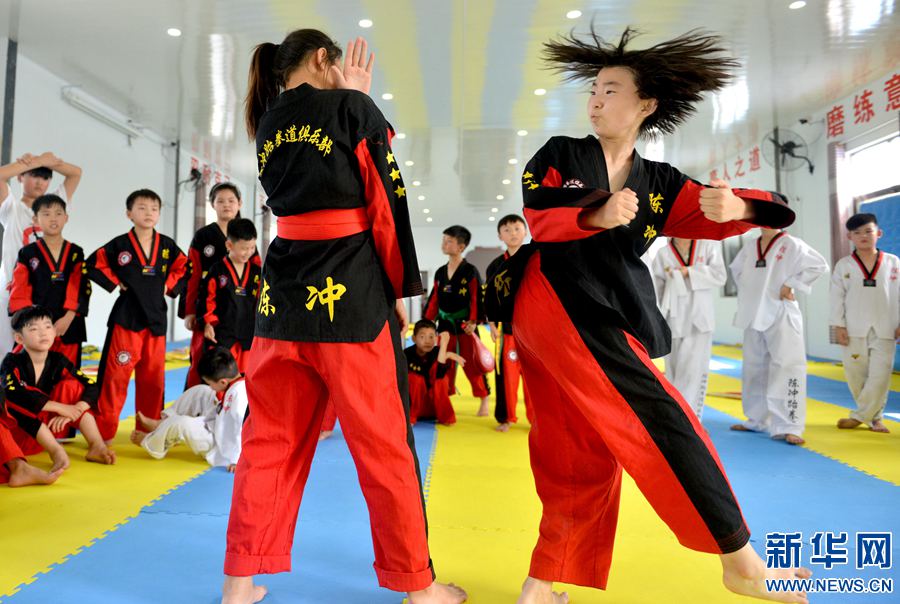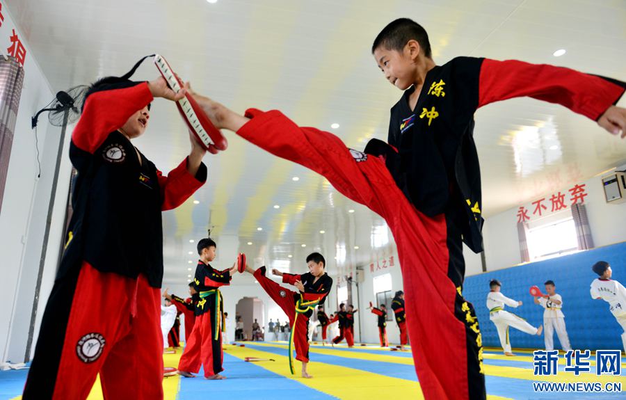 7月4日,少年兒童在河南省夏邑縣跆拳道訓(xùn)練館練習(xí)跆拳道動作。 -