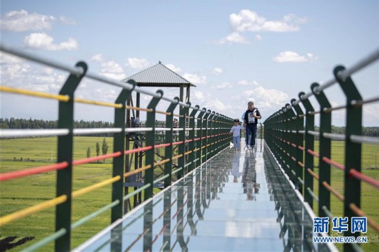 8月18日,游客在新疆察布查爾錫伯自治縣納達齊牛錄鄉(xiāng)稻田畫基地的玻璃棧道上賞景。近日,新疆察布查爾錫伯自治縣納達齊牛錄鄉(xiāng)稻田畫基地進入最佳觀賞期,迎來大批游客觀看。新華社記者 沙達提 攝 -