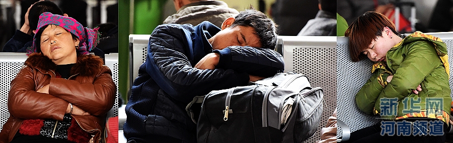 2月11日,旅客在鄭州火車站候車室睡覺休息(拼版照片)。