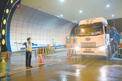 8月1日,一輛貨車通過鄭州圃田高速收費(fèi)站,享受到優(yōu)惠。工作人員引導(dǎo)貨車通過收費(fèi)站。記者王錚攝