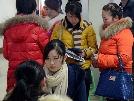 2月25日,幾名求職者在等候招聘單位的工作人員進行面試。