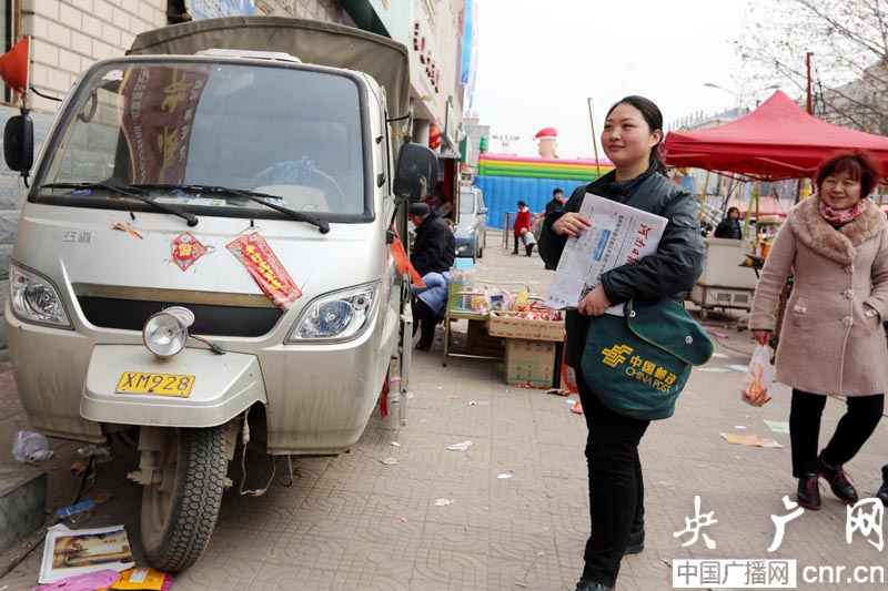 滑縣郵政投遞員張倩肩挎郵包,拎著報刊和郵件,步履矯健,行走在廟會期間的縣城大街小巷