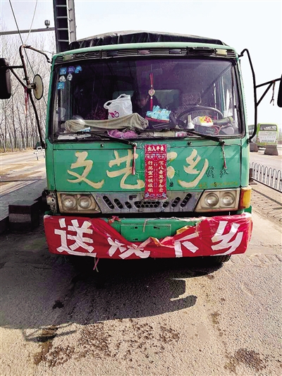 央廣網(wǎng)河南分網(wǎng)消息 2月24日11時(shí)40分,在蘭考縣220國道執(zhí)法服務(wù)站,一輛中型貨車從附近道路駛來,車頭條幅上寫著大字:“文藝下鄉(xiāng)”“送戲下鄉(xiāng)”,不過條幅卻把車牌號(hào)完全遮擋住;車身兩側(cè)用綠漆木板擋著,上面寫著白色大字“山東省定陶區(qū)陶韻二夾弦劇團(tuán)”,車頂上用帆布蓋著。