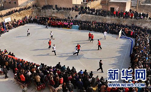 在河南省偃師市山化鎮(zhèn)光明村的一塊標(biāo)準(zhǔn)籃球場(chǎng)上,一場(chǎng)村級(jí)農(nóng)民籃球賽正在進(jìn)行(2月10日攝)。