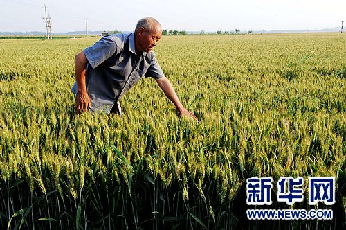 5月19日,河南原陽(yáng)縣農(nóng)民王建業(yè)在田間查看小麥的長(zhǎng)勢(shì)。