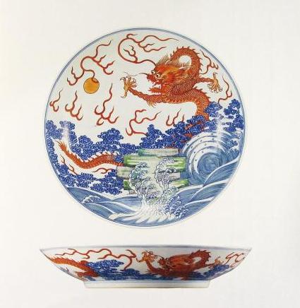 清朝斗彩瓷器的產(chǎn)量要大于明朝成化時期?滴酢⒂赫、乾隆官窯也有不少精品堪與成化斗彩媲美,而且出現(xiàn)了較大的器型?偟膩砜,清朝盛世的斗彩瓷器大多數(shù)繪畫精工,改變了成彩“葉無反側(cè)”、“四季單衣”的弱點,圖案性更強,但也失去了成彩清秀飄逸的風采?怠⒂、乾官窯都有一些仿成化斗彩產(chǎn)品,已能有把握地仿燒出成化斗彩,但這些仿品大都署本朝年款或不落款,只有少數(shù)寄托成化款。對這些器物要從胎、釉、彩繪等幾個方面仔細辨別。清代仿制斗彩瓷器,是從康熙時期開始的。雖然康熙時的多數(shù)產(chǎn)品不及成化的精致,但當時的積極探索為以后燒制斗彩瓷器的成功奠定了基礎(chǔ)。而這件海水龍紋盤,無疑是康熙時期的青花斗彩瓷器中的精品。