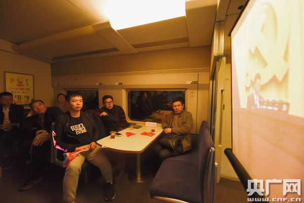 圖為:高鐵上的旅客正在收看中國共產(chǎn)黨第十九次全國代表大會開幕會直播