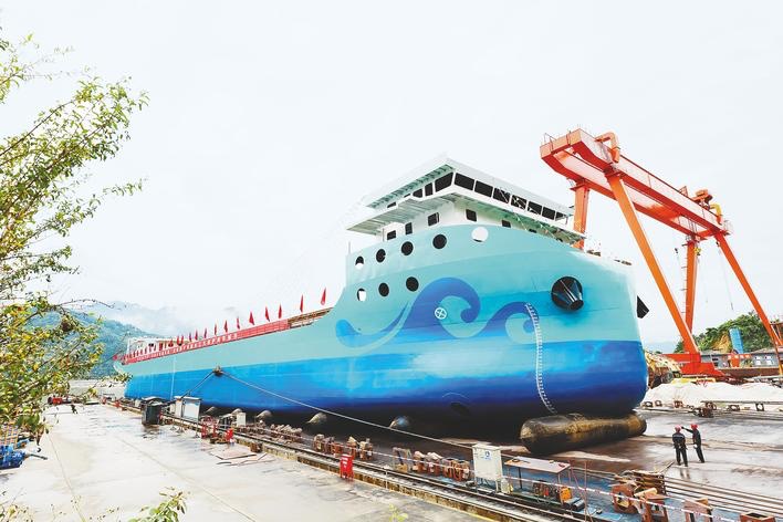 全球最大純電動(dòng)運(yùn)輸船在宜昌下水