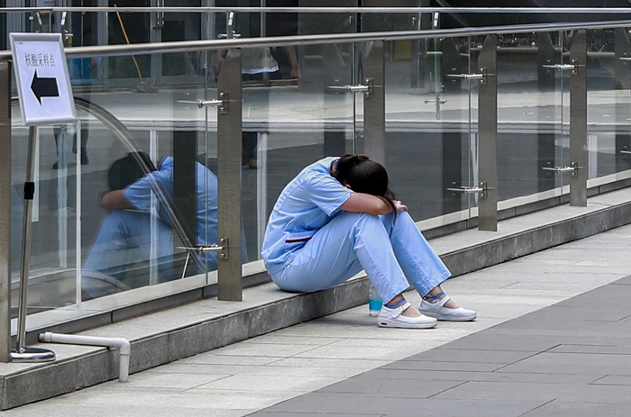 圖為:核酸采樣點旁,一名輪換下來的醫(yī)護人員正在休息 央廣網(wǎng)發(fā) 通訊員供圖