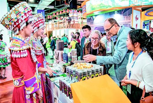 9月26日,外國(guó)游客在恩施硒博會(huì)展區(qū)挑選特色硒產(chǎn)品。第五屆世界硒都(恩施)硒產(chǎn)品博覽交易會(huì)開(kāi)幕,352家企業(yè)的1340個(gè)產(chǎn)品亮相本屆硒博會(huì)。