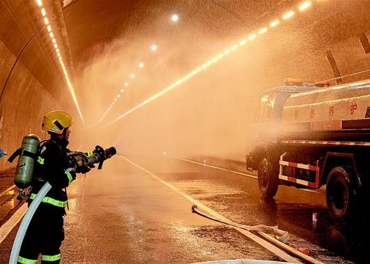 11月16日,省交通運(yùn)輸廳在鄂西高速“荊楚第一隧”——金龍隧道舉行反恐綜合應(yīng)急演練。上午9時(shí),1名“恐怖分子”駕車至金龍隧道入口處縱火,鄂西管理處、路政、高警、公安、消防、長陽縣政府安全應(yīng)急辦等多部門聯(lián)勤聯(lián)動(dòng),成功處置了應(yīng)急“險(xiǎn)情”。圖為隧道內(nèi),消防員對事故車輛進(jìn)行滅火作業(yè)。(視界網(wǎng) 何祝青 攝)