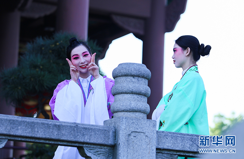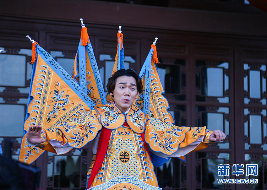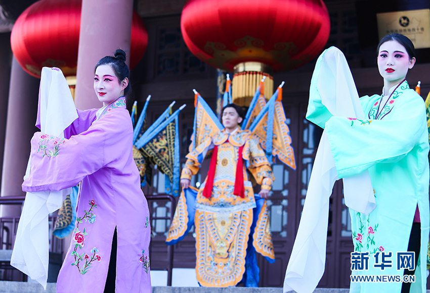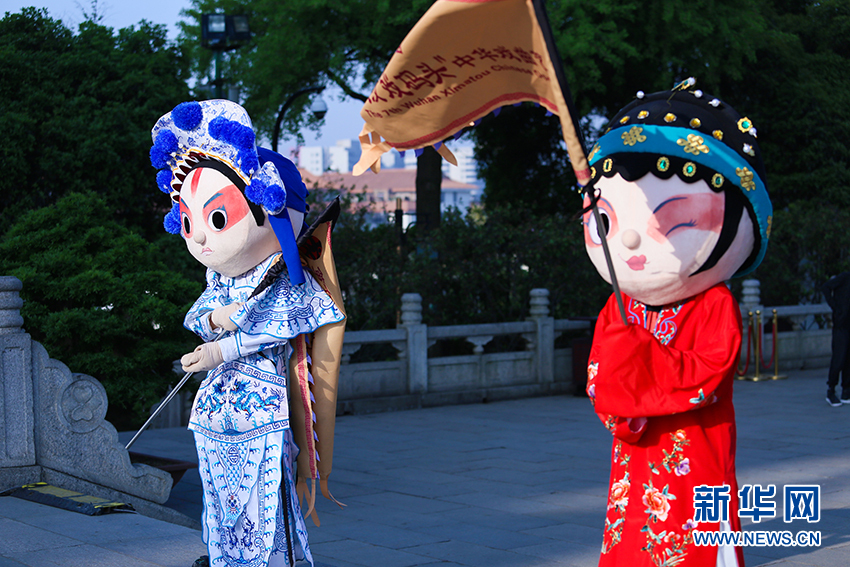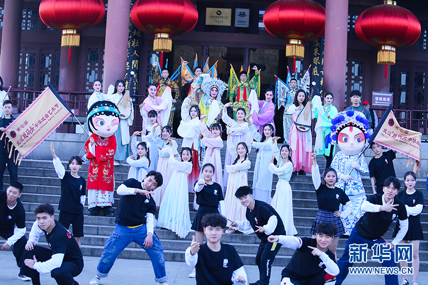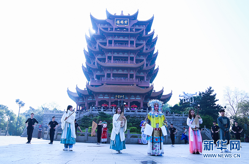 圖為7日在黃鶴樓下舉辦的戲曲快閃活動(dòng)。新華網(wǎng)連迅 攝