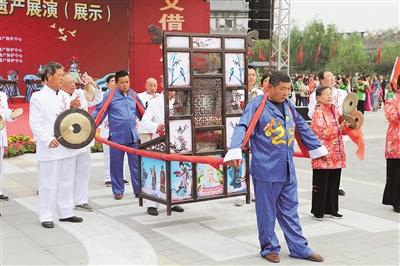 11月2日至3日,襄陽市非物質(zhì)文化遺產(chǎn)展演(展示)活動,在該市唐城景區(qū)舉行,老河口木版年畫、棗陽粗布、襄河道墜子等70多個“非遺”項目集體亮相,吸引觀眾駐足。圖為現(xiàn)場表演國家級非遺項目老河口鑼鼓架子。(視界網(wǎng) 曹鏑 攝)