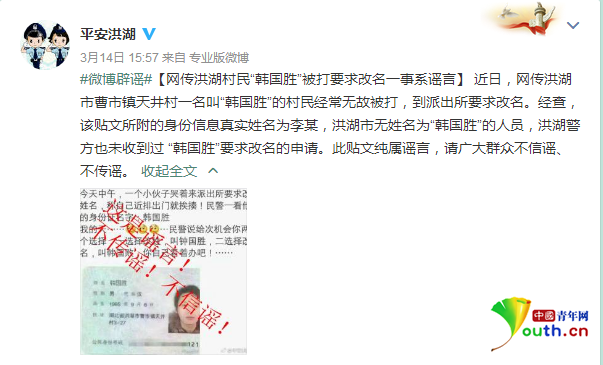 中國(guó)青年網(wǎng)3月15日北京電(見(jiàn)習(xí)記者 劉利影)3月14日下午,湖北省洪湖市公安局官方微博@平安洪湖 發(fā)布微博辟謠稱(chēng),網(wǎng)傳洪湖村民"韓國(guó)勝"被打要求改名一事系謠言。