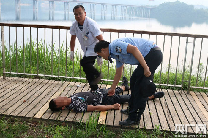 民警趕到現(xiàn)場后迅速展開尋找并在武當(dāng)山太極湖碼頭附近路段一木亭處發(fā)現(xiàn)遺留血跡,但卻未發(fā)現(xiàn)輕生小伙的身影,經(jīng)核實該處和涂某發(fā)送的微信視頻地點一致;為了盡快找到該小伙,民警兵分幾路一路小跑在事發(fā)地周邊尋找,通過不懈努力,18時50分許,民警白鵬等人在環(huán)湖游步道上將依靠在湖邊柵欄旁的涂某找到,此時該小伙已處于極度虛弱狀態(tài),繼而陷入昏迷狀態(tài),經(jīng)簡單包扎后,民警合力將涂某送往醫(yī)院救治,經(jīng)醫(yī)生搶救,涂某逐漸蘇醒,目前傷勢已無大礙。事后,民警通過微信群向家屬們報平安。
