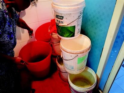 記者采訪發(fā)現(xiàn)多位居民家中都是備著十來(lái)個(gè)水桶和熱水瓶(如右圖)。
