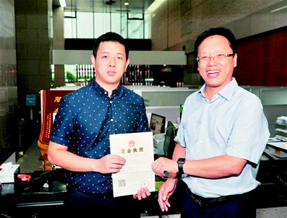 圖為:企業(yè)負責人(左)從武漢市工商局局長劉濤手中領(lǐng)到首張“28證合一”工商執(zhí)照