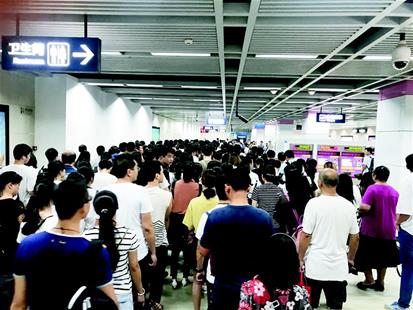 圖為:昨日18時(shí)23分,楚河漢街站內(nèi)站滿了等待安檢的市民