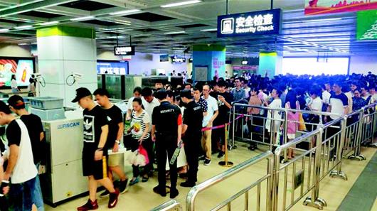 在中山公園站,大學(xué)生小趙也表示,他除了手機(jī)和少量現(xiàn)金外,隨身沒有任何行李和包裹,卻要和所有人一樣排隊(duì),很耽誤時(shí)間!澳芊駟为(dú)設(shè)一條沒有行李的通道,像火車站那樣,安檢員拿安檢儀一掃,市民就可快速通過!