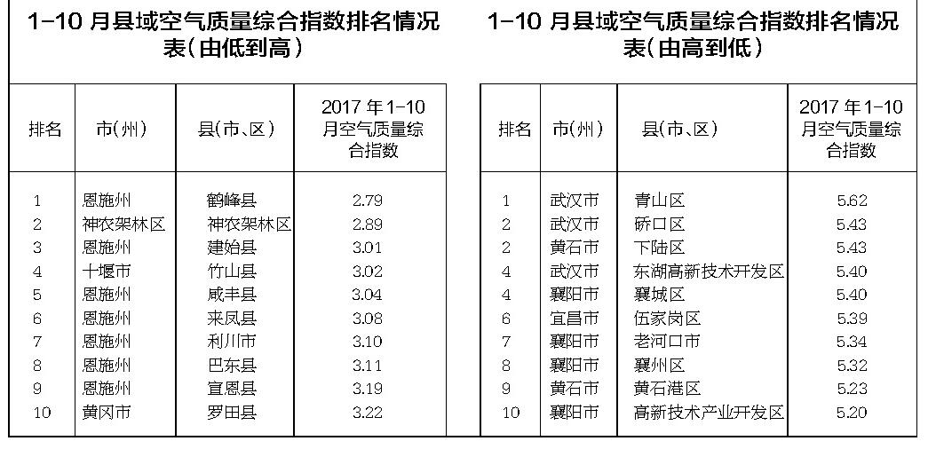 湖北省縣域2017年1-10月空氣質(zhì)量綜合指數(shù)排名情況通報(bào)