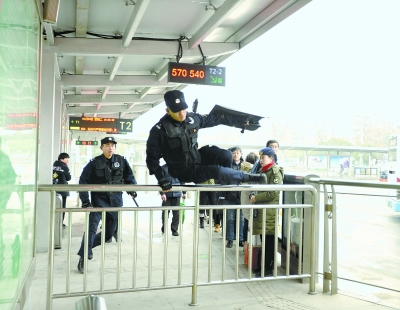 正在附近巡邏的公交反恐安保大隊隊員接到司機“一鍵報警”通知后,迅速趕到事發(fā)公交車 記者張寧 攝