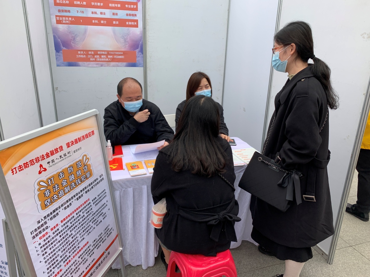 央廣網(wǎng)武漢3月21日消息(實(shí)習(xí)記者顏瑞華 通訊員朱素芳 潘宇翔 黃珍伲)3月21日上午,伴隨著一段鼓舞人心的快板表演,“夢(mèng)想‘櫻’你而來(lái),才聚江漢風(fēng)采”專(zhuān)場(chǎng)招聘會(huì)拉開(kāi)序幕,這是武漢市江漢區(qū)在西北湖畔武漢金融街這一全省唯一的“省級(jí)金融業(yè)集聚發(fā)展示范園區(qū)”,為金融、商貿(mào)等企業(yè)開(kāi)展的精準(zhǔn)招聘會(huì)。全區(qū)50家企業(yè)和用工單位,提供崗位1675個(gè),慕名前來(lái)的招聘者們紛紛在展臺(tái)前瀏覽招聘信息,最終120人達(dá)成就業(yè)意向。