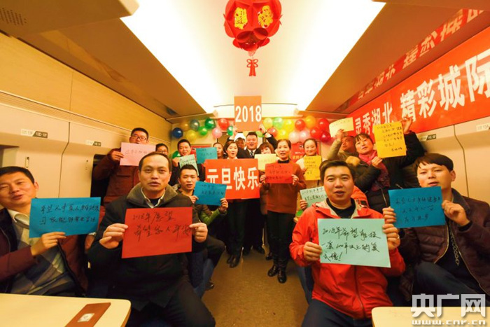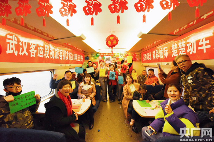 央廣網(wǎng)武漢12月31日消息(記者張毛清 黃炎秋 通訊員蘇杭 宋進(jìn)軍)“我希望今年我的孩子能考上理想的大學(xué)!”“我希望我可以找到一個(gè)女朋友!”“我希望我們的國(guó)家更加繁榮昌盛!”12月30日上午,在黃岡東開(kāi)往孝感東的C5342次列車(chē)上,武漢客運(yùn)段舉行了慶元旦聯(lián)歡活動(dòng),動(dòng)姐與旅客共同寫(xiě)下新年愿望,相互祝福,迎接2018年的到來(lái)。