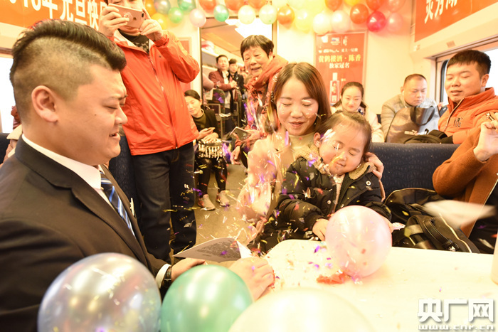 “平川雁陣映殘陽(yáng),謎底是春字!”來(lái)自孝感的乘客張女士高興地參與了扎氣球猜字謎的游戲,在大家的歡呼聲中,她扎開(kāi)了一個(gè)寓意“元旦快樂(lè)”的氣球,答出了謎底,贏得了動(dòng)姐送上的一份精美禮品,樂(lè)的合不攏嘴。
