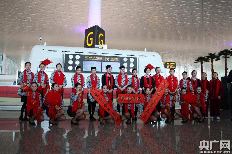 春運(yùn)首日 天河機(jī)場(chǎng)空姐表演才藝為旅客送行