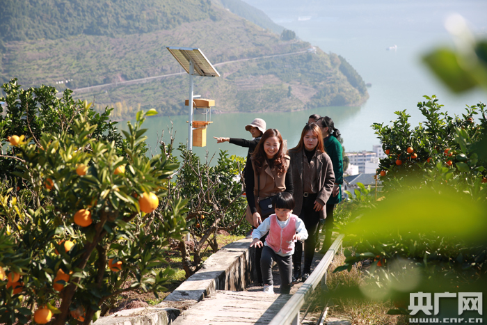 放眼望去,成片的橘林遍布在長(zhǎng)江兩岸,黃澄澄、金燦燦的柑橘點(diǎn)綴其間,構(gòu)建了一幅林水相依、生態(tài)優(yōu)美的美麗畫(huà)卷。以長(zhǎng)江為背景,依偎著橘樹(shù),大家不停地忙著在橘園拍照留影。橘園里,游客們不僅可以欣賞漫山遍野的橘林美景,還能親自采摘品嘗新鮮橘子。