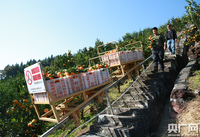 一箱箱新鮮的柑橘“乘坐”單軌運(yùn)輸機(jī),從橘園深處來(lái)到橘林外的通暢公路,打箱裝車(chē),運(yùn)往縣城或集鎮(zhèn)的物流點(diǎn),運(yùn)往山外的大中城市。
