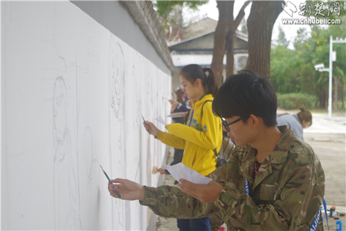 志愿者對著底稿在墻上勾畫。楊瀟 攝
