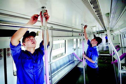 圖為8月2日,地鐵2號(hào)線首批33輛列車(chē)全部完成架修工作,重獲新生后繼續(xù)投入運(yùn)營(yíng)。圖為工作人員在列車(chē)內(nèi)部檢修 通訊員產(chǎn)啟斗黃彥供圖