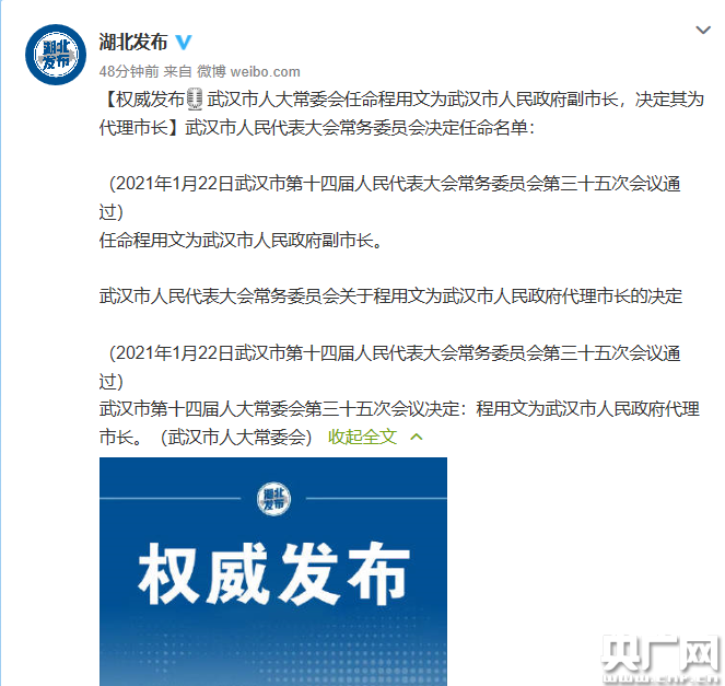 央廣網(wǎng)武漢1月22日消息(記者黃炎秋)據(jù)湖北省人民政府新聞辦公室官方微博“@湖北發(fā)布”消息,程用文任武漢市人民政府副市長(zhǎng)、代理市長(zhǎng)。