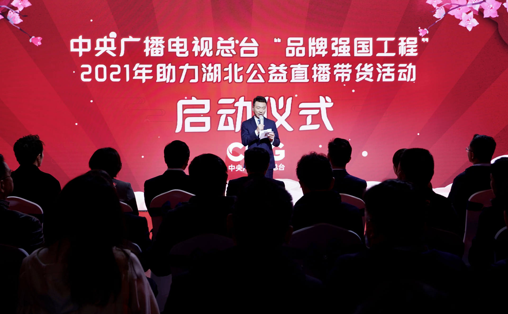 今年1月8日,中央廣播電視總臺“品牌強國工程”2021年助力湖北專項公益行動在北京、武漢兩地實時連線。中宣部副部長、中央廣播電視總臺臺長慎海雄和湖北省委書記、省人大常委會主任應勇共同啟動專項公益行動?偱_在啟動儀式中宣布,2021 年將繼續(xù)免費提供 5 億元廣告資源,助力湖北經濟恢復,提振全國消費者對“湖北制造”的信心,并為“湖北制造”舉辦 5 場直播帶貨活動,進一步推介湖北特色產品、拉動銷售。