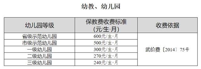 根據(jù)公示,省級示范幼兒園保教費每月600元/生,市級示范幼兒園500元/生,一級幼兒園300元/生,二級幼兒園270元/生,三級幼兒園240元/生。