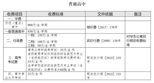 武漢市普通高中收費項目,包括學(xué)費、住宿費、高考考試費。其中,示范(重點)高中每學(xué)期學(xué)費900元/生,一般普通高中630元/生。住宿費分3檔:150元/生、100元/生、50元/生,學(xué)生公寓另行核定收費標(biāo)準(zhǔn)。