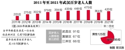 記者查詢往年數(shù)據(jù)發(fā)現(xiàn),近年來,武漢90歲以上長壽老人持續(xù)增多。截至今年第二季度,全市90歲以上老人28411位,其中百歲老人420位(男性125位,女性295位),女性百歲老人占70.2%。全市年齡最長者是一位女性,住在新洲區(qū),已有110歲高齡。在男性百歲老人中,最年長的是3位106歲老人。